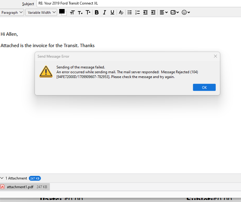 Getting error 104 with or with out attachments. I have uninstalled and reinstalled the program with no change. This started after changing our domain provider. Doesn't happen every time but I can never get through the day without the error. Once it errors, I can't send any emails. Closing and restarting the program doesn't help. Don't seem to have any trouble receiving. I have received emails in the same session that sending failed. Any suggestions?