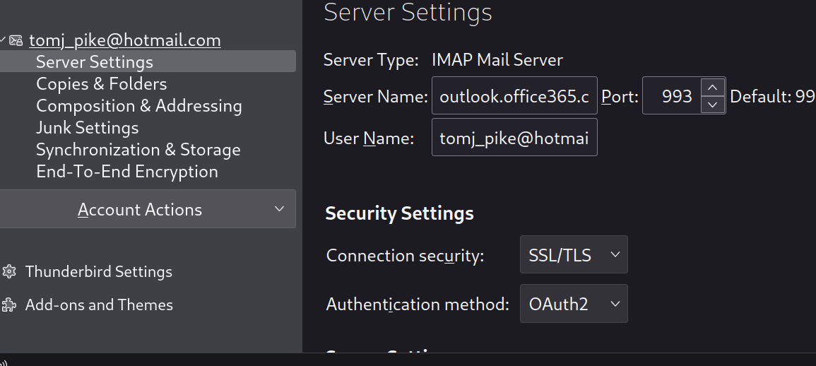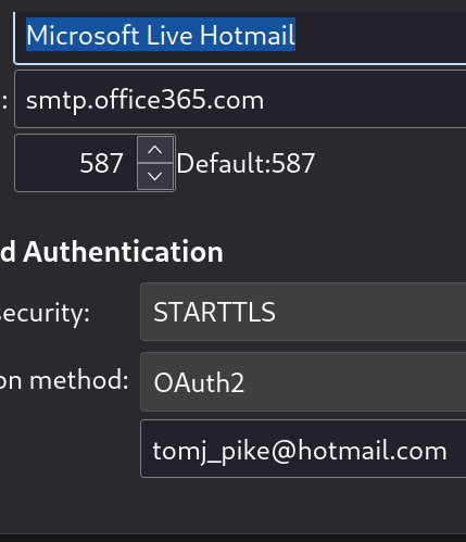 CORECTION to last post - I found the outgoing server settings. But when I view them, it offers me the default of smtp.outlook365.com and when I use this, or alternatively when I add a new entry for smtp.outlook365.com, in neither case is there an option to set OAuth security. (This is in contrast with the entry for my Gmail account which is set to OAuth.) So I am still stuck. Please help! Tom.