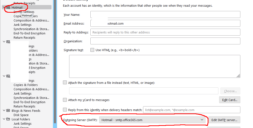 No Outgoing Mail. After following the advice and applying the changes I got TB to receive Hotmail OK But I just tried to send an email, and nothing happens. When I check, there is no SMTP entry in my saved passwords, so I guess that this is the problem. But I cannot find any way to enter an SMTP password. Contrary to some advice there is no Outgoing Server option in Settings . Can someone guide me to a solution please? (I am using a Linux/TB/Hotmail system.) Tom.