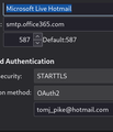 sfhowes, many thanks again for your input. The problem persists although things have moved as follows : 1. I had previously tried to get Hotmail entered as instructed, but failed because there was no option for OAuth. So this time I entered all the details and set to 'normal password' and this was accepted. Then I used the edit function and amazing, the OAuth option was now in the drop-down list. So I set the Hotmail entry to OAuth. 2. So there is now an entry in my saved passwords for Hotmail with OAuth security. 3. The Outgoing Server settings are correct as you show in your last post. 4. But there is no entry for smtp Hotmail in my saved passwords list (there is such an entry for my Gmail). 5. I still cannot send an email from Hotmail - I just get a pop-up asking for my password, but if I enter my regular Hotmail password the pop-up just hangs. I have tried logging out and back in, to no avail. Any further help will be much appreciated, Tom.