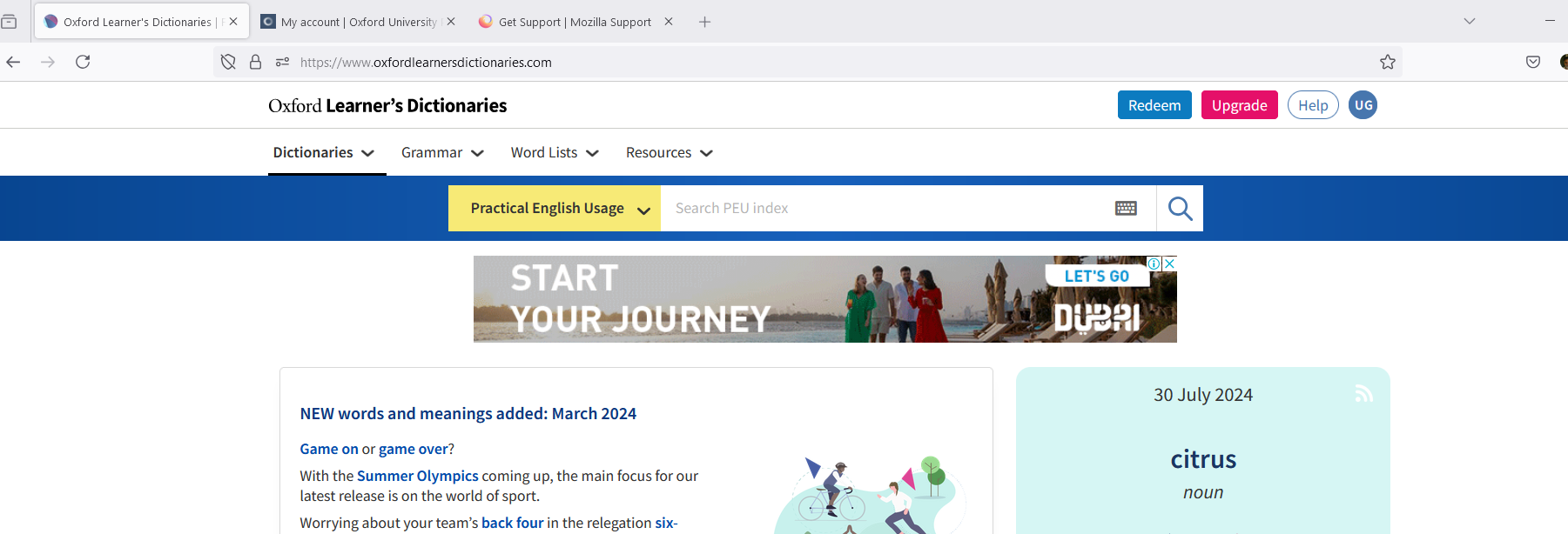 Hello, Please see the screen shot. The site - https://www.oxfordlearnersdictionaries.com/ opens without any difficulty. I want to redeem a code for Practical English Usage that I bought with the Oxford Dictionary. To this I need to go my account to open- https://account.oup.com/myProfile/learningMaterial Unable to open this site. Not even in other browsers. Tried deleting cookies etc. No help