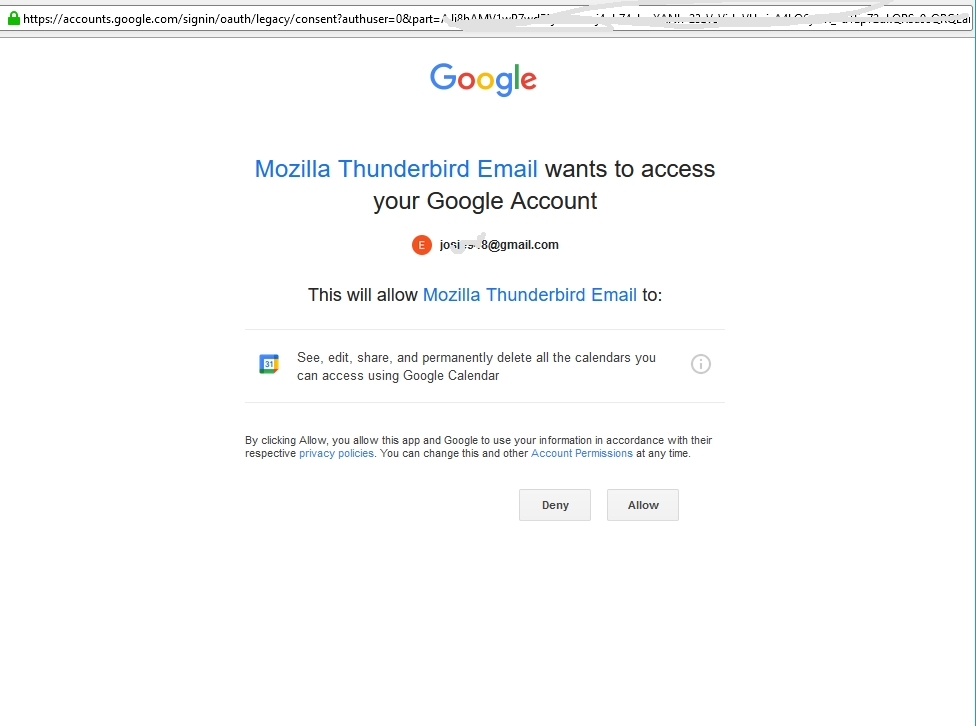 My wife's computer gets this message every time she starts TB, and it's making her quite unhappy. I've checked the permissions settings in Google - and it's set to allow TB to do it's thing on the Gmail account. I tried removing all the calendars from Thunderbird, and then restarting. No error message. I added back calendars, and I was asked for permission for each calendar that lives on Google, same screen as has been posted above (but I'll include mine for clarity in case anyone doesn't know what the screen is saying..)