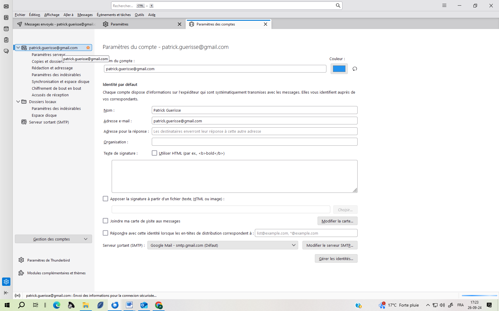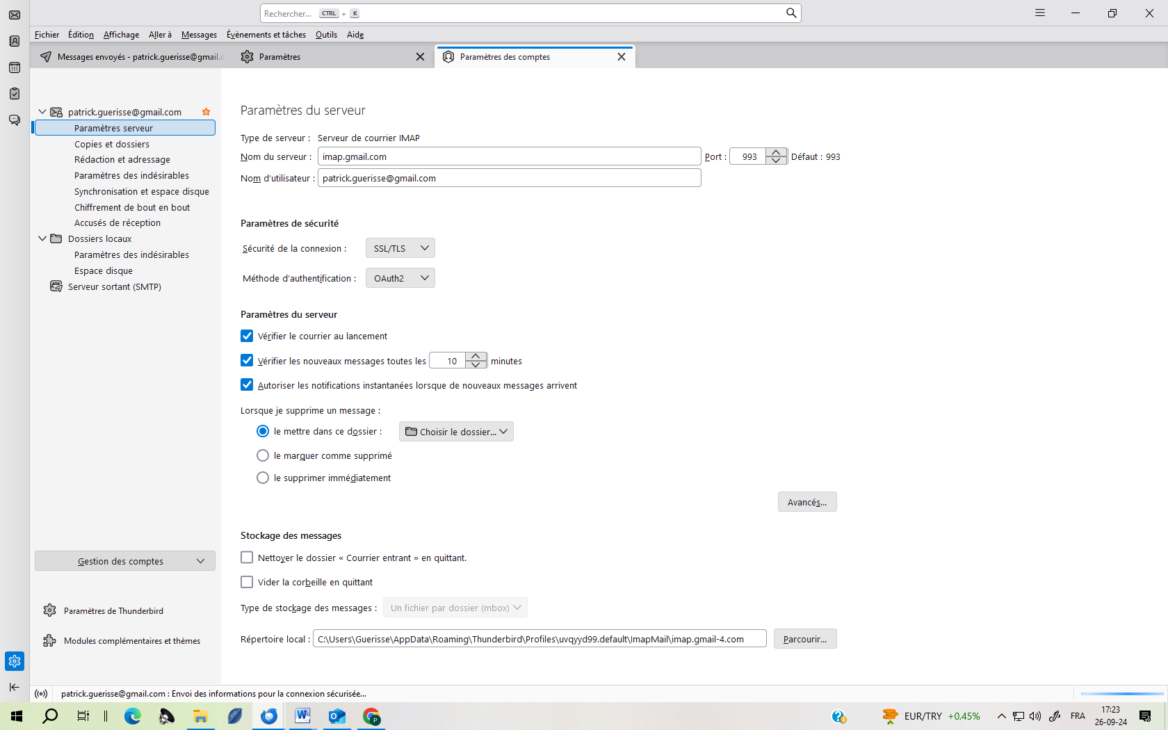 I had to change my Google password. Immediately after the change on sept 14th, I was and am still unable to send or receive mails, receiving the message : "Authentication failed when connecting to imap.gmail.com server". Giving my permission/consent to allow Mozilla accessing my Google account is useless, because it is repetetively asking me to give my password in " imap.gmail.com" . I don't know how to do that : in the settings, there is no place to write my password. Do you have a solution ? Many thanks