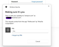 I never heard Amazon login would ask for PIN? I think that is something else other then Amazon or Firefox doing. I have Firefox forum account login and Amazon account and never saw this popup. If you can provide a screenshot of this error it would help others see if they get the same when going to Amazon as well. But block out any private data before posting to be safe so people just see the site itself and can see if the error happens on their side.