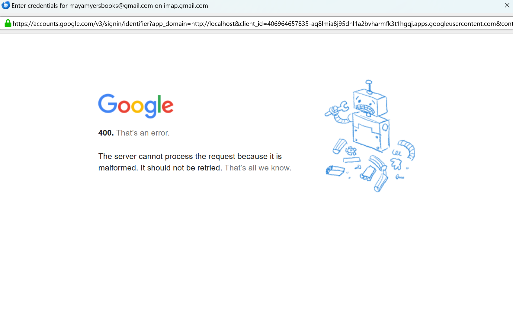 I have 5 Gmail accounts that I have been using in Thunderbird for years. One of them was glitching a lot, so I removed it, then tried to add it back with no luck. I uninstalled and reinstalled Thunderbird, which automatically populated with my other four accounts, but still can't reinstall the fifth account. When I enter my account and password, it says "Configuration found in Mozilla ISP database" with a green checkmark. Then it takes me to Google, and shows my correct email address. When I hit Next, I get a 400 error message every time. "The server cannot process the error because it is malformed. It should not be retried. That's all we know." Can anyone help?
