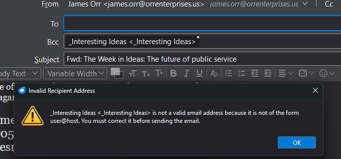 I have a few short lists that I use to keep track of different group activities. After the newest update, when I add the list to the BCC box, I get a message that is like "address is not in the form of username@host". I have never seen this before, and it disturbs me a lot. How do I fix it?