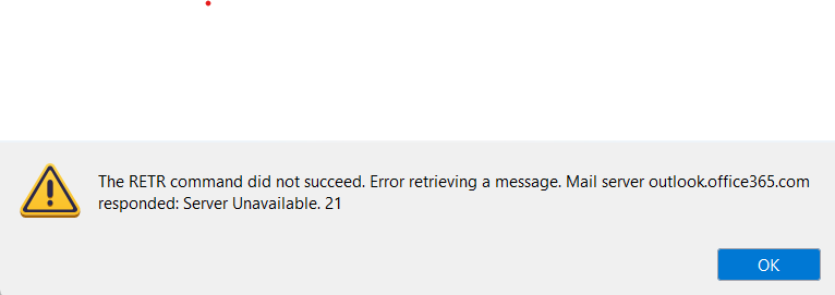 The RETR command did not succeed. Error retrieving a message. Mail server outlook.office365.com responded: Server Unavailable. 21