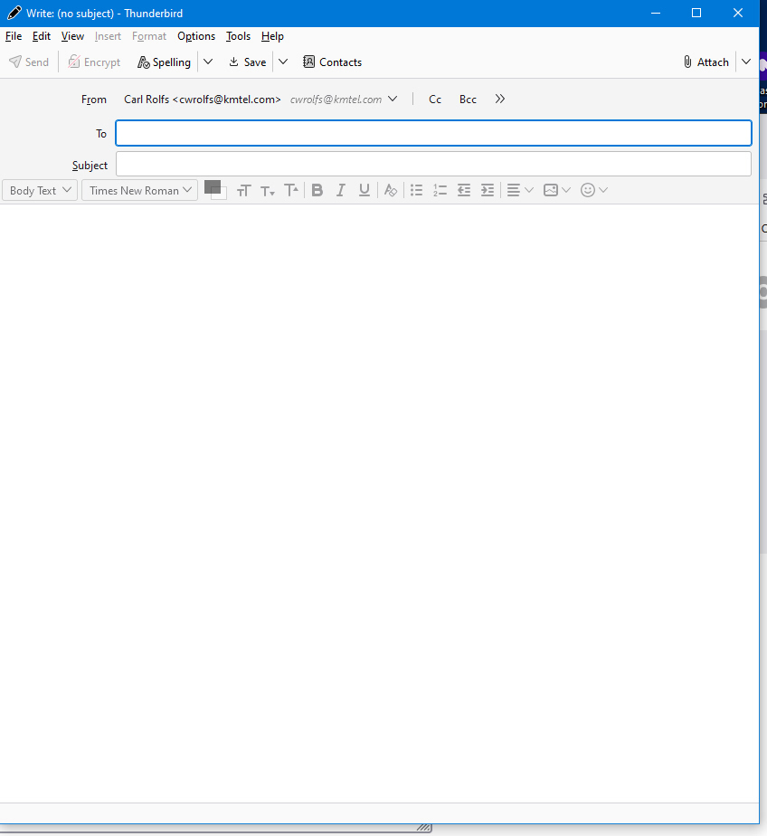 Open "+ new message" to write an email. The window does NOT have window control options (File, edit, view, insert, format, options, tools, help) OR email control options (Send, encrypt, spelling, save, contacts, attach).