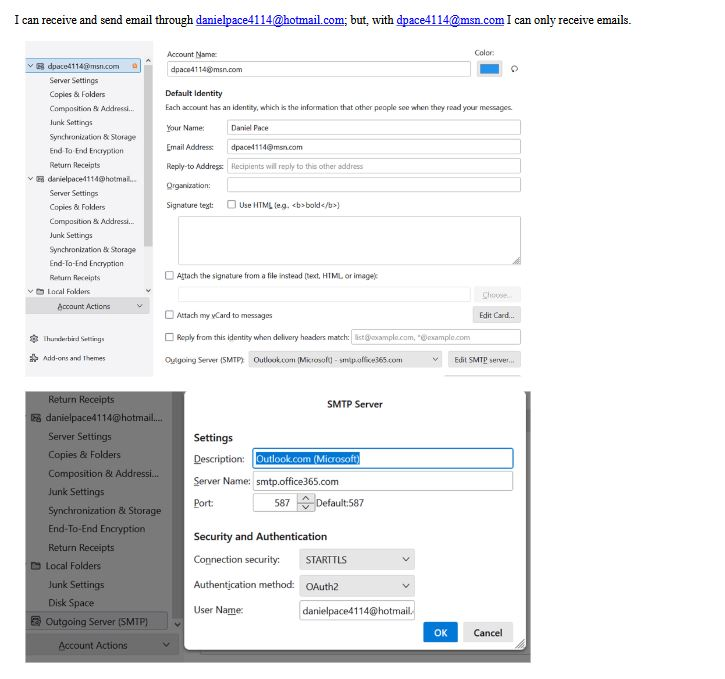 I have two email accounts in Thunderbird 128.7.0esr. I am using a Windows 10 operating system. I can receive and send email through [email removed]@hotmail.com; but, with [email removed]@msn.com I can only receive emails. I have attached screen shots of account settings. Please help in very simple terms. I am an old guy! Thank you, Dan