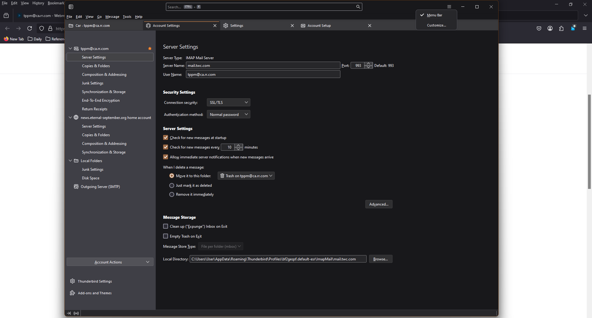 Puzzling. your user name is tppm.ca.rr.com? It may help to see screenshot of your incoming server settings pane.