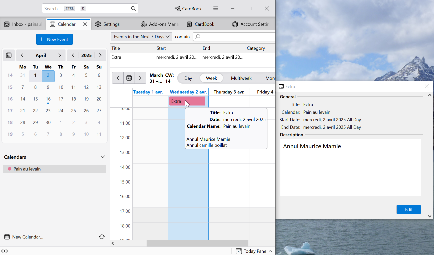 I'm having a strange issue with Thunderbird calendar: I have a CalDav calendar (hosted at infomaniak) set up in Thunderbird. I also have that calendar on my cellphone but using infomaniak sync app and some calendar app on the phone.