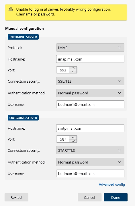 No matter what settings are used Thunderbird says the unable to login at server. I have tried multiple variations to the configuration with the same results. I have an existing gmai laccount that works. I can access my email.com thrrough the browser fine.