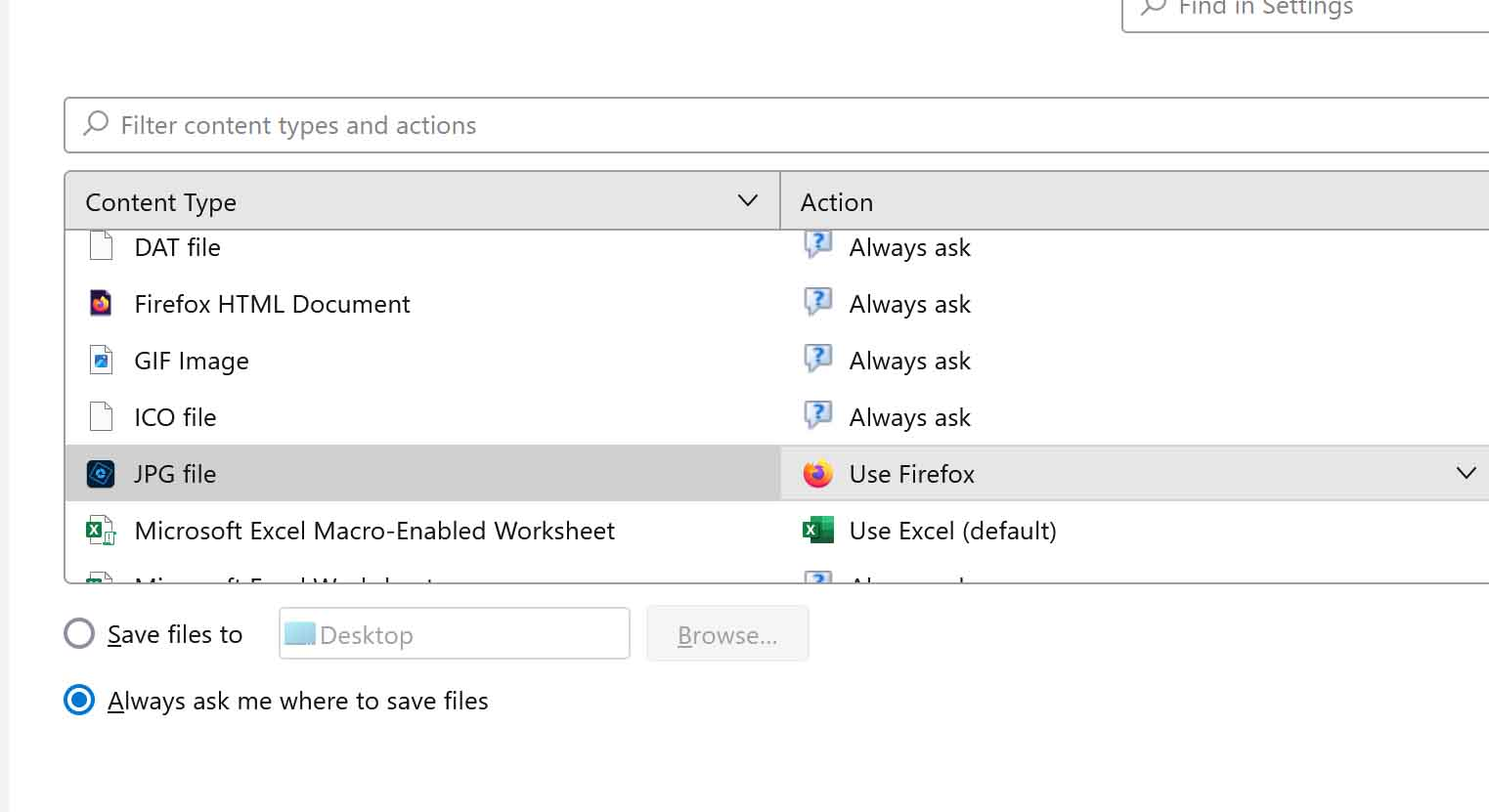 Content Type: .jpg Did you completely remove this by clicking on the 'Action to see drop down and selected 'Remove Action' ? So there is no .jpg content type - it has completely gone from list.