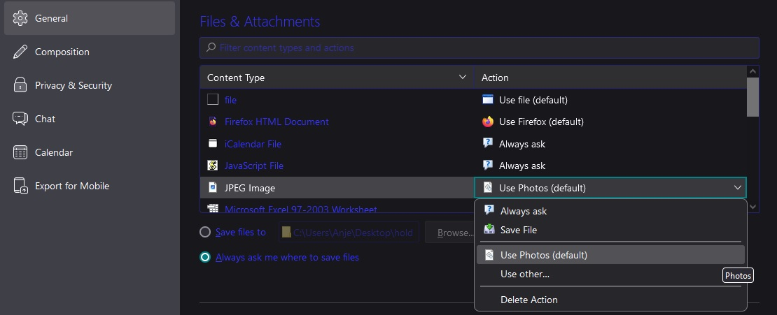 Thank you for your help. Unfortunately not solved. I am windows 11 24H2. I have checked in windows settings and photos is the apps option. Thunderbird settings There is no option for photos under files and attachments nor anyone marked as default. The jpg content is showing a logo for Adobe photoshop elements and even when that is not chosen as a method to open the logo is still there by the jpg. I have always ask as where to save. See image