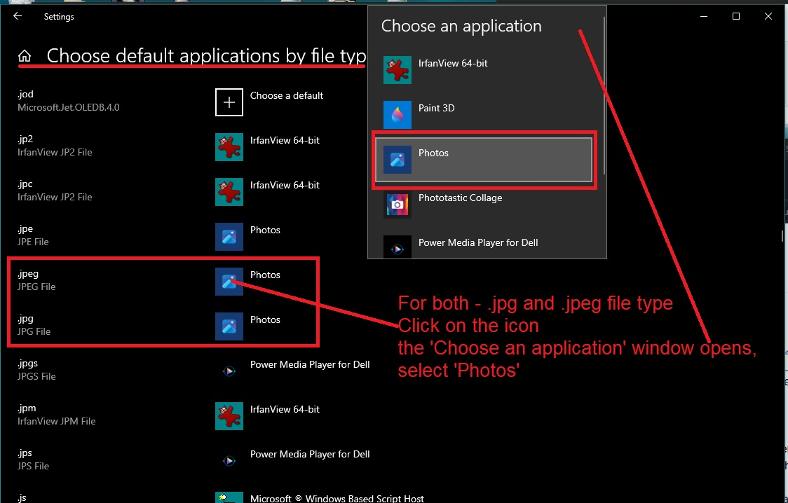 - The 'Default application by file type' says jpg and jpeg uses 'Photos'