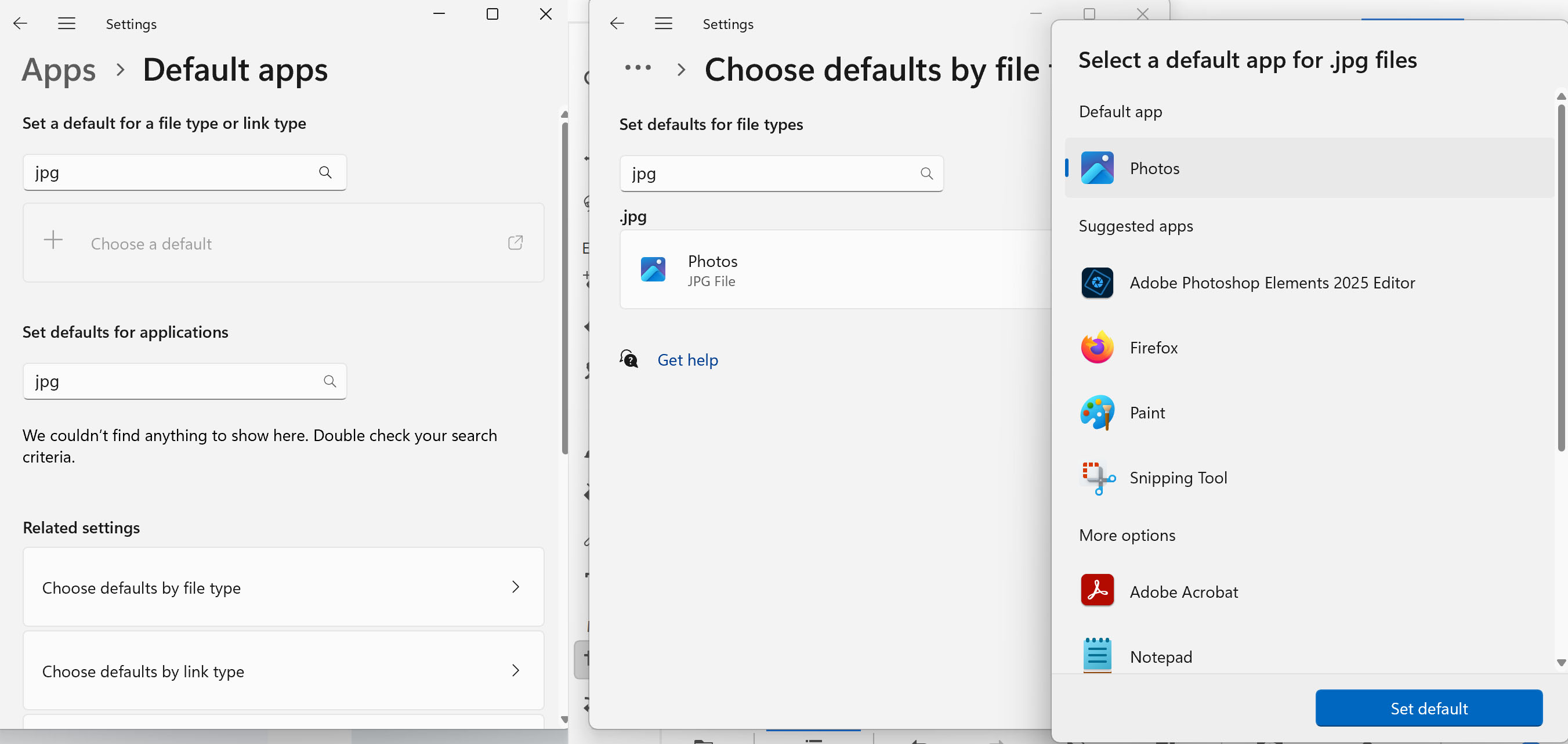 I still need you to check the computer 'Default application by file type' for jpg and jpeg because you have it set up for Adobe photoshop elements and it should be Photos.