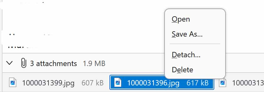A jpg atttachment no longer opens with right click. I have looked at settings, in files and attachments and have tried, open with photoshop elements, open with firefox, always ask, and save file. None make any difference. I can right click on the attachment and the menu says open, save etc. click on open and nothing happens.