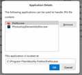 The two items above on the slider are mspaint and snipping tool. The bug in the display info is really helpful as I have had to close the item each time to get out! now I can cancel. I have deleted the jpg action. Unfortunately still nothing on thunderbird, I can get a menu that says open on right click, but nothing happens when used. This has been the case all along. For info before I deleted the jpg the Application details screen showed as below, no option for photos, just firefox and adobe photo. Thank you so much for your time on this problem it is really kind.