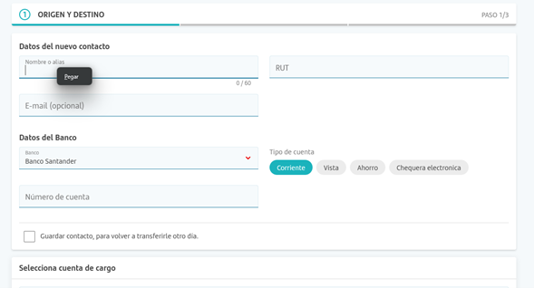 Persistent “Paste” tooltip appears automatically in recipient form on Banco Santander Chile website, blocking input.