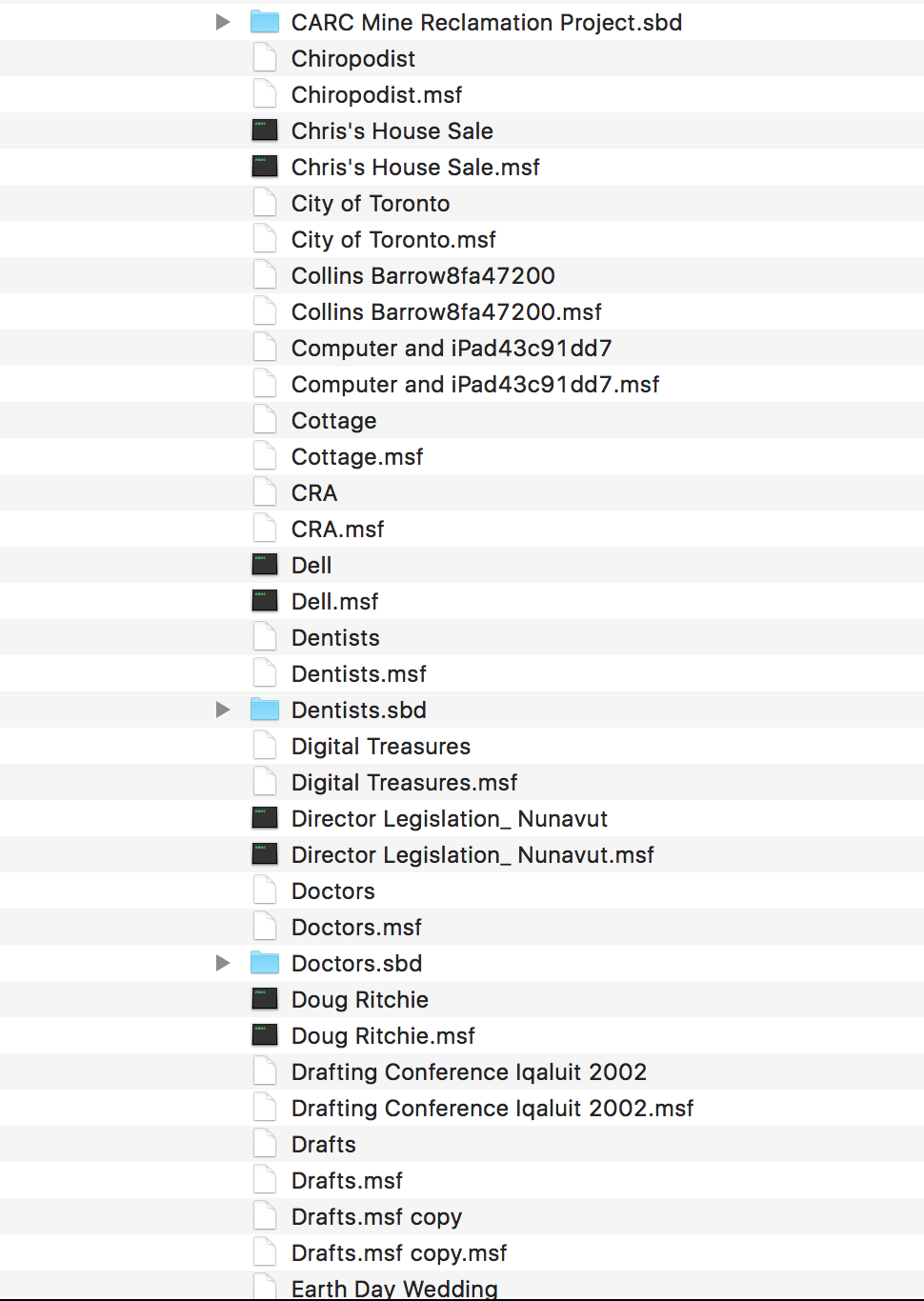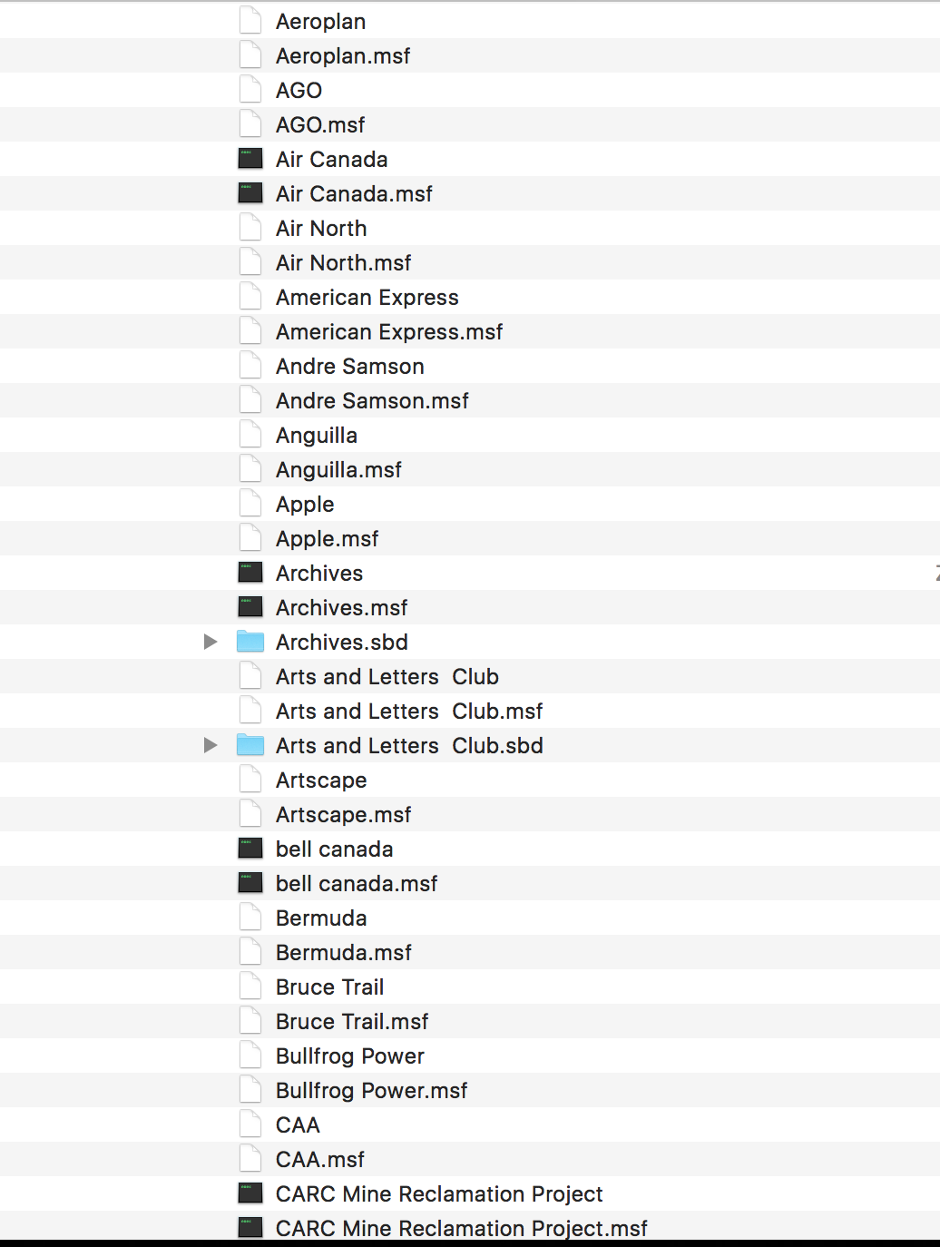 Thanks so much for this advice. Before I attempt this, I should mention that my wife has approx. 130 folders for the messages she has collected over the years. Here are a couple of screenshots of her folders from "A" to "E" just to give you an idea. Can all these plus the rest of the ~130 message folders be transferred over to the new Mac (and I assume I would transfer only the items without suffix, for example "Aeroplan" but not "Aeroplan.msf")?