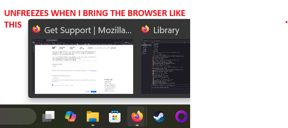It is a strange freeze though - the whole browser becomes VISUALLY unresponsive, but if I click blindly, say to close the tab or if I scroll up or down it appears to work. How do I know? Well, if I drag the mouse to the bottom of the taskbar in Windows and bring up the thumbnail... It unfreezes the browser - showing the changes I made blindly, at least until it freezes again when the MPEG-4 files start playing again. The freezes are not temporary either - I need to unfreeze through this thumbnail method I described above - otherwise it stays frozen.