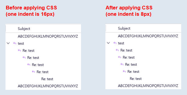 /* change the width of one indent */ .table-layout .subject-line { margin-inline-start: calc(var(--one-indent) * var(--thread-level)) !important; --one-indent: 8px; }