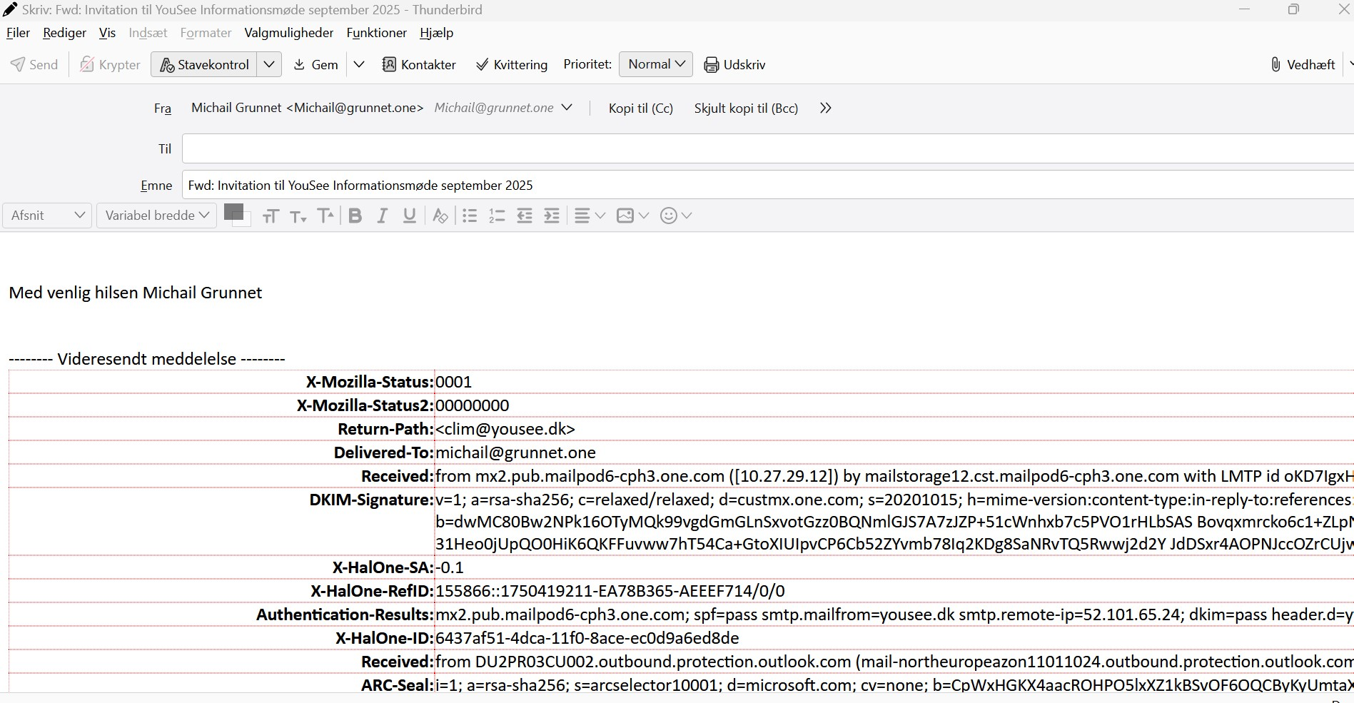 Når jeg laver en videresend af en mail, bliver de tekniske data vedrørende den videresend mail vis i den nye mail. Se vedhæftet screen shot. Inden jeg installerede den seneste opdatering skete det samme ved: svar mail, videresend mail, print mail. Efter opdatering at Version 140.0.1 | Released July 9, 2025, har jeg ind til nu kun konstateret at fejlen kun findes ved videresend. Mvh Michail