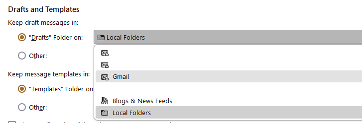 If your Inbox is acting like a Drafts folder, the instructions say to select 'Other' for the drafts target, and select the affected Inbox. The first picture shows an example with gmail. In the next step, choose the correct Drafts folder, as in the second picture. According to the bugzilla topic, the Inbox should no longer act as a Drafts folder. I cannot test this, as the issue doesn't happen on my setup.