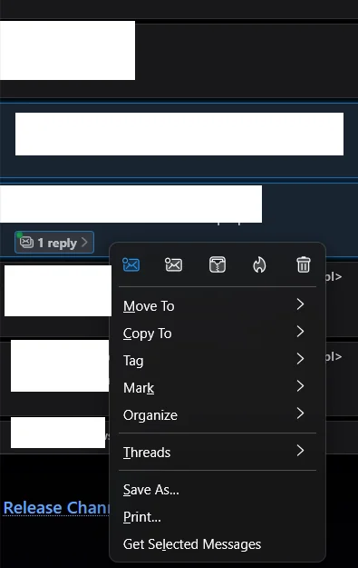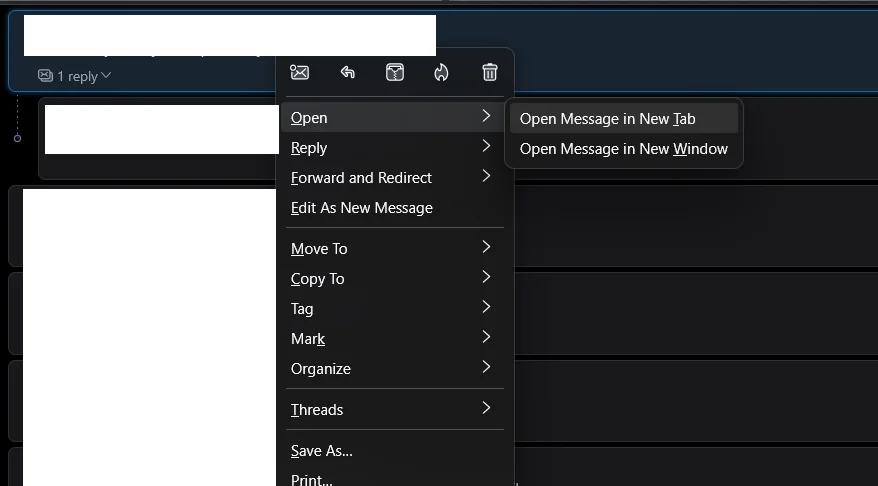 Interestingly, if I click on something like “1 reply” to expand the thread, then right-click one of the messages inside, I do get options like “Open Message in New Tab” or “Open Message in New Window” but still no “Open in Conversation”