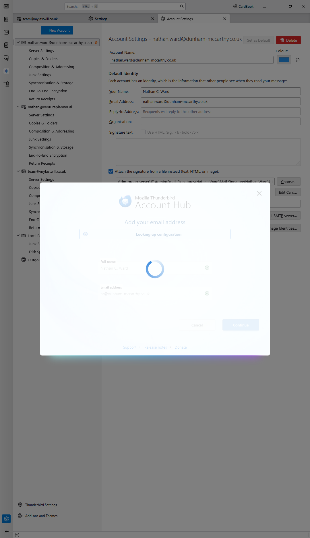 I am using Thunderbird 140.0.1 (64-bit) for Windows and with this update there is a new account windows sety up. When adding a new account it only asks me for the email address and when I press continue it I get a blue circle going round and round and no progress. In previous versions I would input the email and password and this would work.