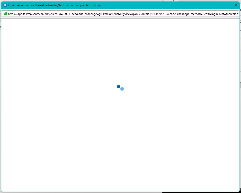 Hi, I now think that the problem is with Fastmail, not Thunderbird. I have 4 PCs (2 Win 11 & 2 Win 7) here in Sandy Bay. Using SMTP for incoming emails, I succeeded in accessing my Fastmail account (therealdedwards@fastmail.com). On the other 2 PCs I get the blank window "20290919 TBird get emails failure.jpg" which never goes away. After I close it, I get the 20290919 Unable to log in at server.jpg" error message. It doesn't make any difference if I use SMTP or POP3 for the incoming mail. When I hear back from the Fastmail ticket I have submitted, I will post another reply. David.