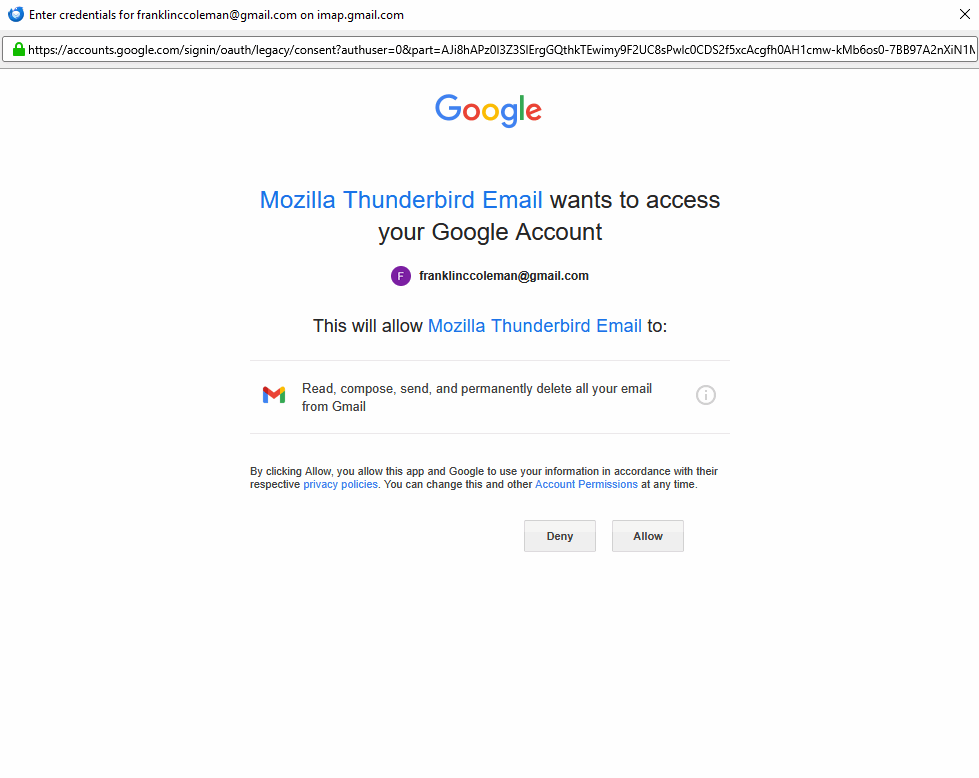 Every few minutes Mozilla Thunderbird interrupts my work by posting a pair, one after the other, of a request to grant access to my Google account. See screen-save image attached. It pretends to give me the choice of "Allow" or "Deny", but when I click "Deny" it simply waits a few minutes and then comes back again. This is insulting and frustrating. How do I make it stop? (Other than clicking "Allow", that is, as I DO NOT WANT to grant access for the list of dangerous purposes provided in the pop-up.) Thank you.
