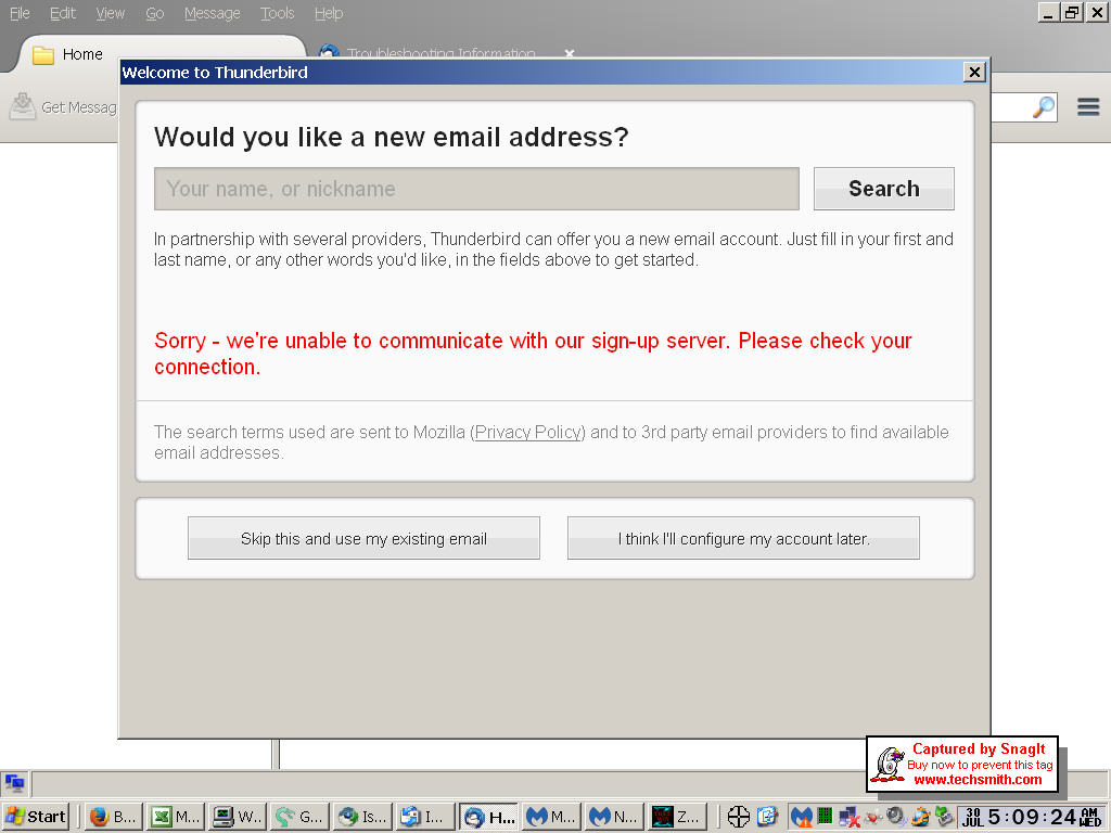 After working normally for more than a year, last week when I started Thunderbird there was a popup page with an error message that kept repeating itself "Sorry, we're unable to communicate with our sign-up server. Please check your connection." And behind this error page was the main Thunderbird frame with tool bars, but nothing else. All the email and email folders had disappeared.