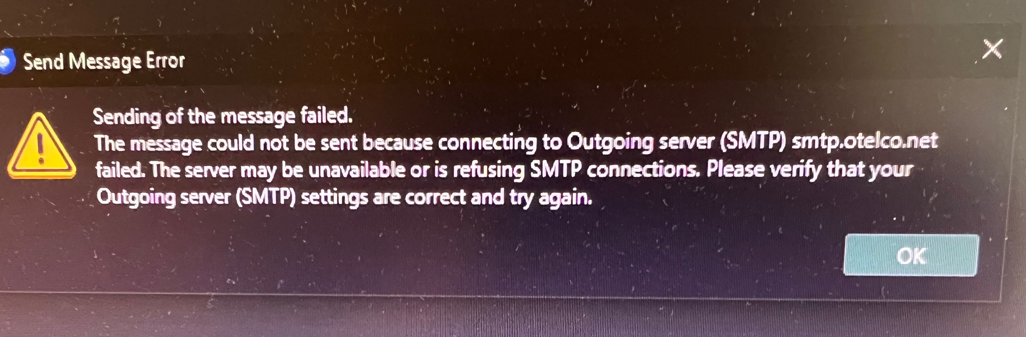 Unable to send emails after 140 update - "the connection to Outgoing server (SMTP) mail.otelco.net timed out. Try again."