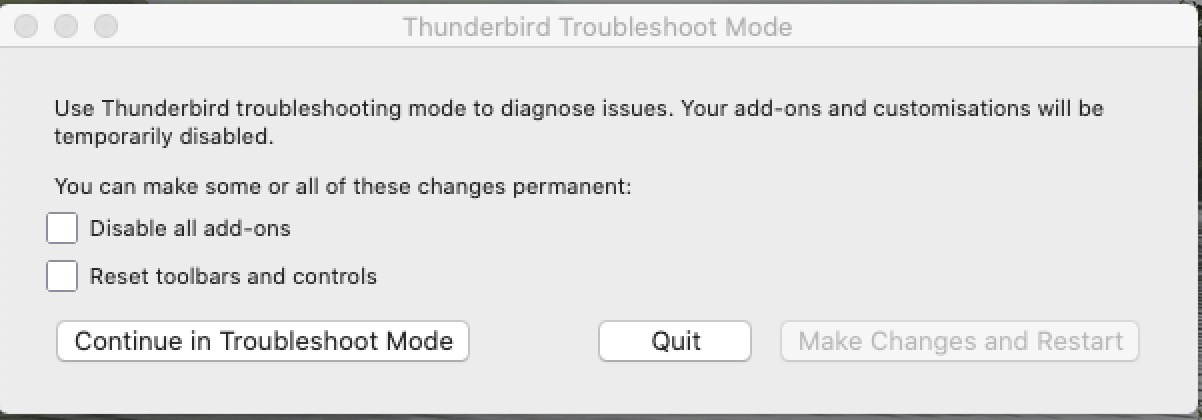 Nothing really new happens when I start Thunderbird with the Alt key down in the troubleshoot mode.