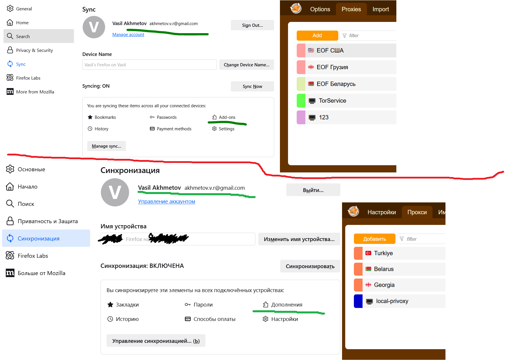 hello i tried to synс FoxyProxy via FF Add-On Sync a expected proxy options transferred to another notebook but nothing happens