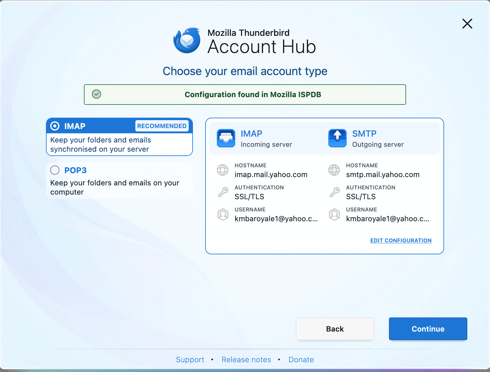 My main yahoo email address is @yahoo.de which works perfectly. A second address @yahoo.com has not worked for a longer time. The Account Hub recognises the configuration for this account (see screenshot) but when I click "continue" this message appears - CAN'T ACCESS PROPERTY "CLEANUP", THIS [# CONFIG VERIFIER] IS UNDEFINED. I would be extremely thankful for any advice.
