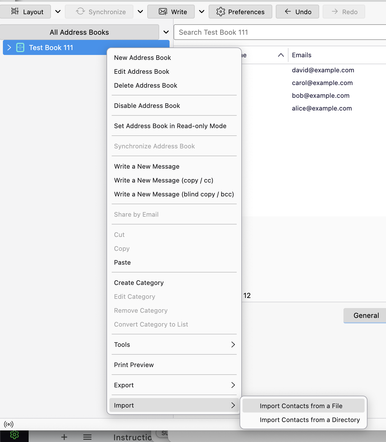 Once that is done, right click on the name of the new address book you created, then go to import at the bottom (see image) and select "Import from file" Then select your Outlook CSV