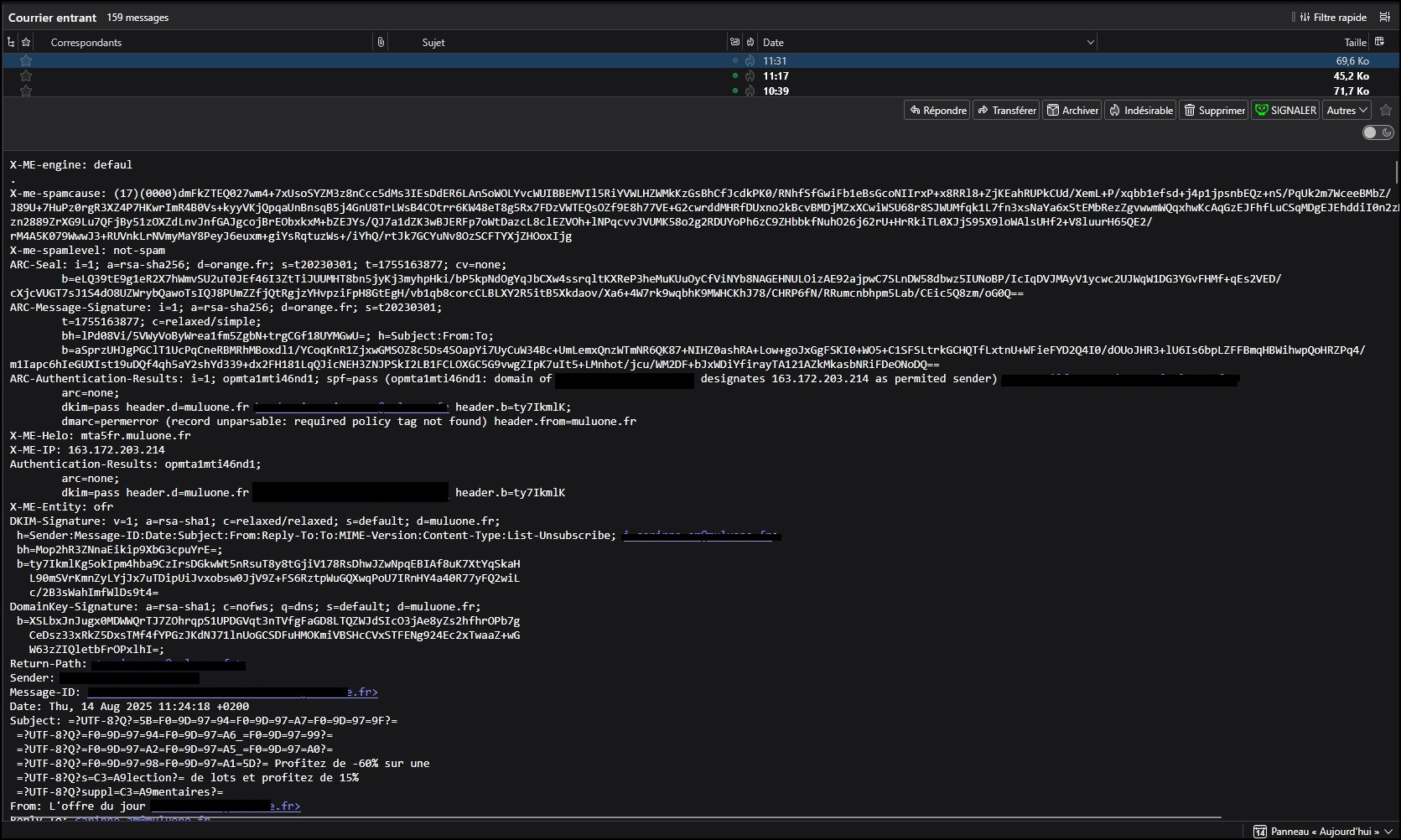 Hello, Writing from France so please excuse my poor english... Since the 07/10/2025, my new mails are not as before and I cannot read them. It works on my phone with Orange app but not on my computer wilth Thunderbird. My gmail mails work on my phone and Thunderbird on PC. Please just have a look on this screenshot and tell me me what happened. Someone can tell me what to do ? Thank you. ORBIS.