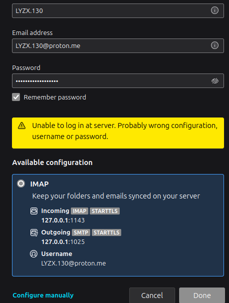 You’ll need to use Proton Mail Bridge to connect ProtonMail with Thunderbird. Proton doesn’t allow direct IMAP/SMTP logins with your normal password.