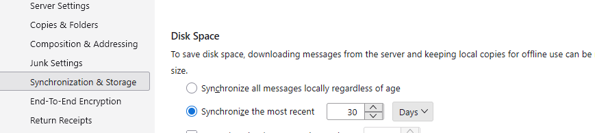I have a small laptop I use when out of the office. It has very little memory. So for that copy of Thunderbird, I don't want all the old emails to be downloaded, just new and the few most recent, say two weeks or a month worth. Can I limit the downloads of old email or make them on demand?