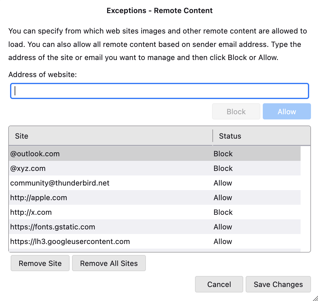 There, you can add either specific email addresses or domains to either a block or whitelist. Thunderbird supports domain-level blocking and adding, but not the use of wildcard (*) characters, like you might see in outlook or gmail. (i.e. type @apple.com , not *@apple.com). That might be why you were not having luck with domain blocking when you tried.