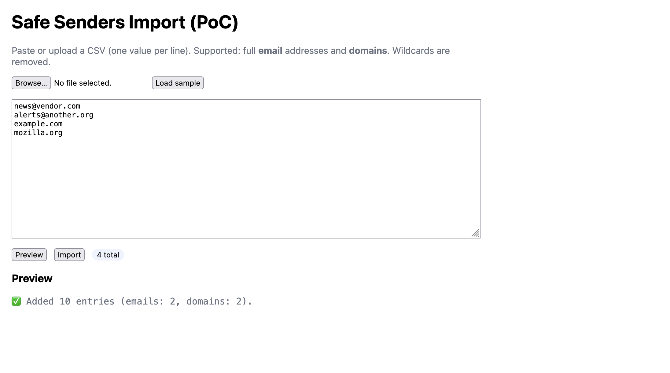 It imports a flat file (TXT or CSV, one address or domain per line) into Thunderbird without scripts or extra hoops. It’s an early prototype, but it works on my side. It is 'experimental', and it will ask the user for a couple of additional permissions that we do not normally surface in standard add ons. These permissions are only used to import and manage the list.