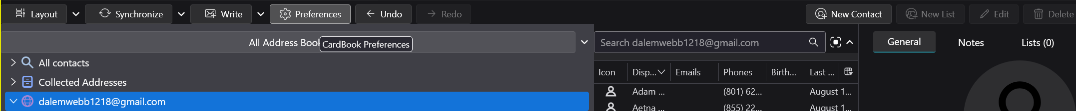 OK. Unfortunately, still confused. YOU: Yes, it appears that lists can no longer be created in Contacts in CardBook, but if a label is created on the Contacts website, it will appear under the CardBook Contacts address book after syncing (see picture). FROM WITHIN THUNDERBIRD, I have these address books: Personal Address Book (appears to have some, but not ALL entries present in Google Contacts) Address Book (appears to be the one synced with Google Contacts) Collected Addresses (entries put there by TB)