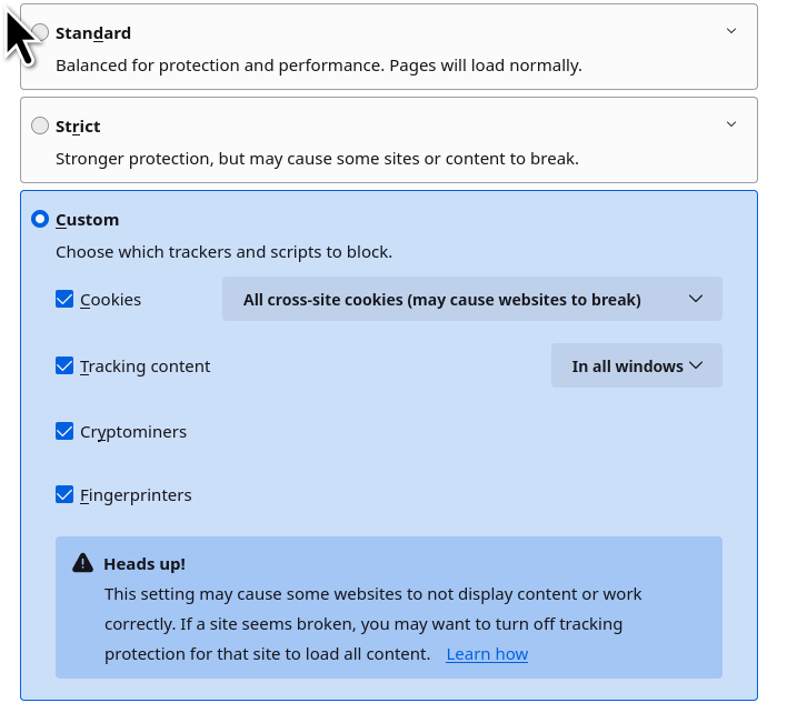 What site? What are your settings here? see screenshot Do you have the same issue with Firefox in Troubleshoot Mode? https://support.mozilla.org/en-US/kb/diagnose-firefox-issues-using-troubleshoot-mode#w_how-to-start-firefox-in-4troubleshoot-modesf5safe-modesf