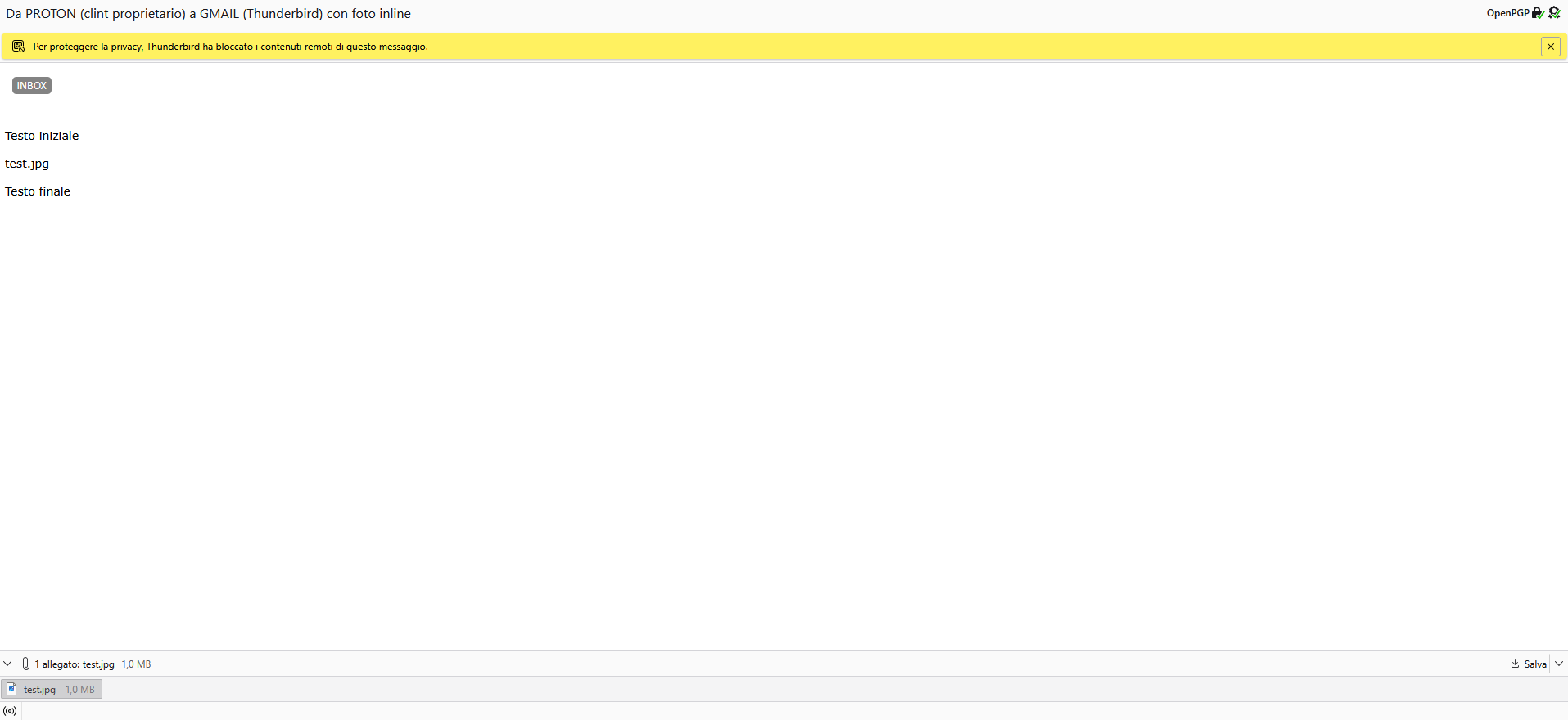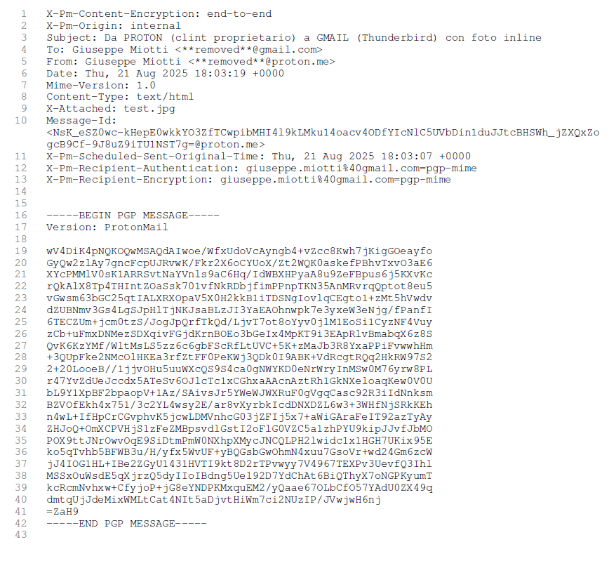 Grazie next - nel penultimo post ho tagliato il file sorgente della mail che era da centinaia di righe, credo che per questo la cifratura PGP appaia incompleta. Ora ho provato con una immagine da 20KB, mandandola con TB alla casella GMAIL da GMAIL stessa (come da te suggerito) - vedi allegato, si vede tutto correttamente senza warning di TB - ma anche mandando la mail da PROTON - TB segnala il warning e lo mette come allegato -. Ti riporto qui di seguito il sorgente dei 2 messaggi (prima TB vs TB poi PROTON vs TB).