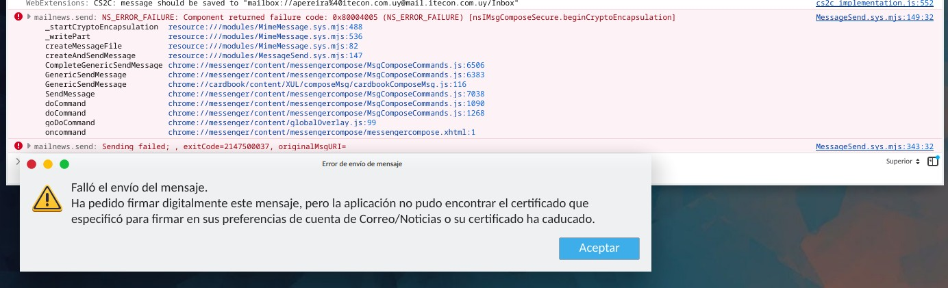 I'm attaching a screen capture were shows the error message and the Developers Console showing the exitcode when trying to send a mail with digitally signed.
