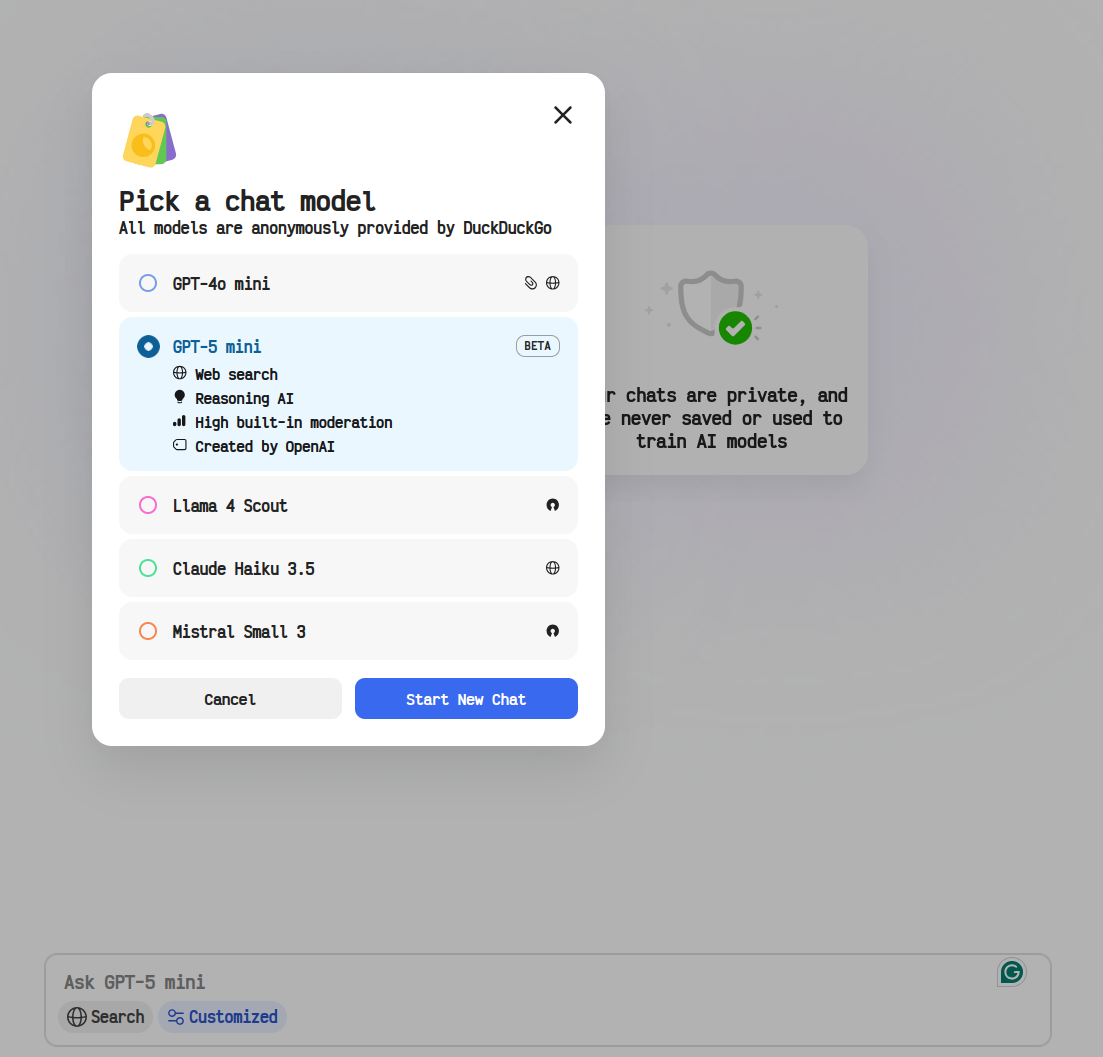 Duck.ai can utilize multiple models and integrate duckduckgo's own search engine ^_^