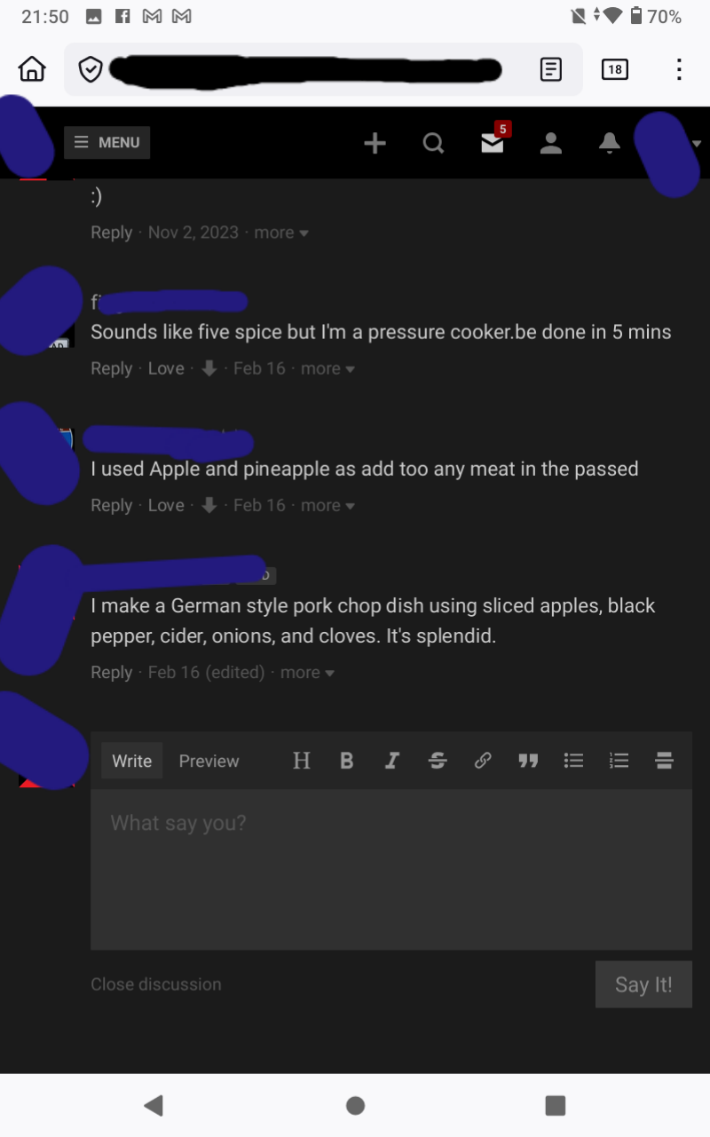 I'm attaching two images. One is a screenshot of the discussion showing the text entry box and the other is a photo of what the screen looks like when I tap in the box to enter text. I cannot get an actual screenshot of the white screen because attempting to take one minimizes the keyboard and the problem only occurs when the keyboard is in use. I masked a lot of stuff on the images because it's a private and secure site. I'd be willing to share more information only with the Mozilla technical team.