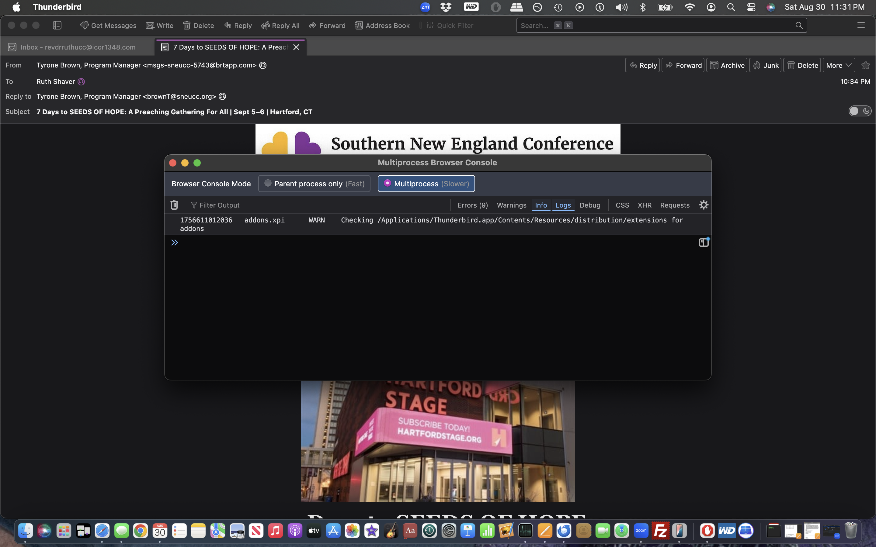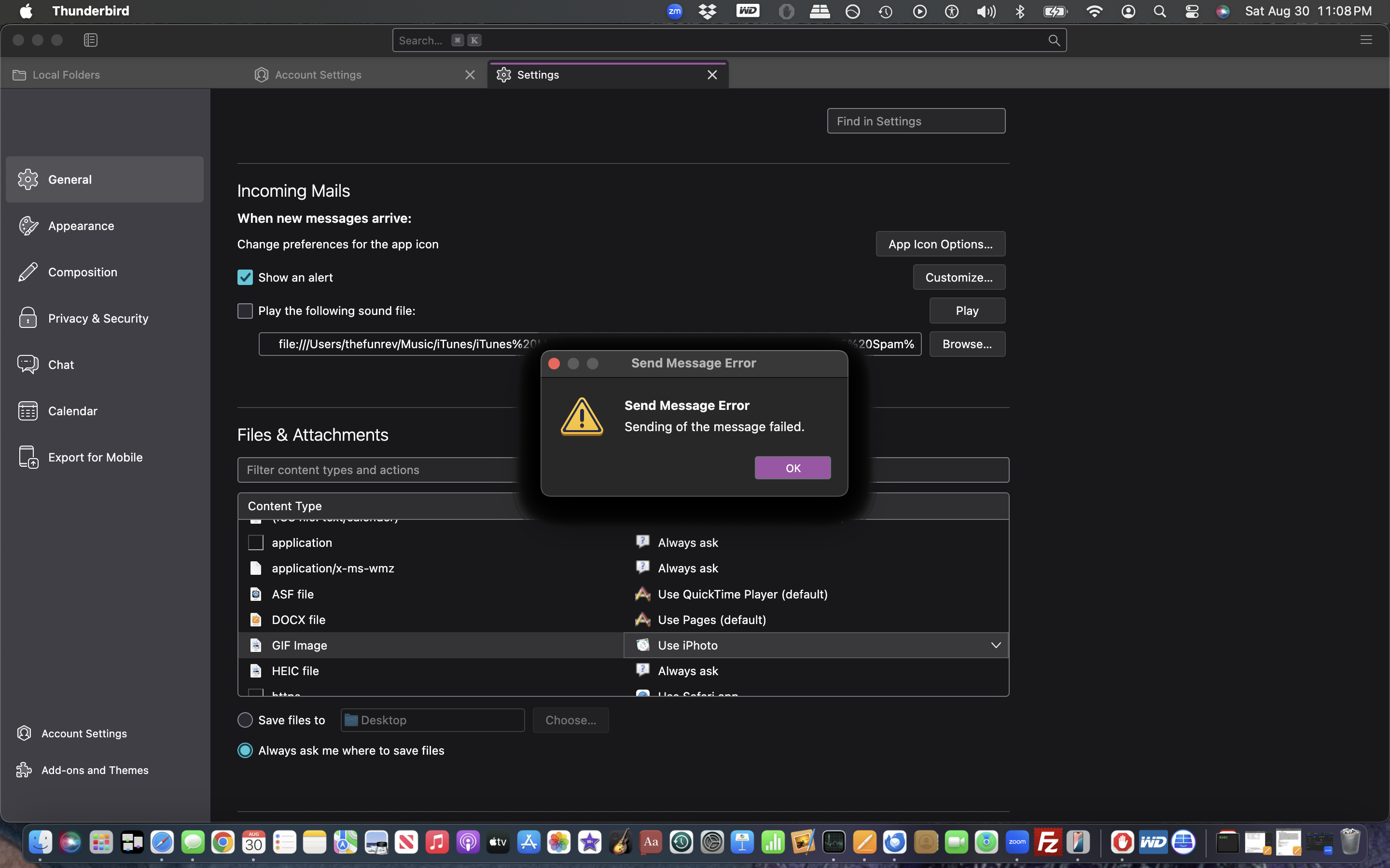 I'm running Thunderbird 140.2.0ers on a 2018 MacBook Pro/Sequoia 15.6.1 and am getting a very strange error message that will not clear and that is not accurate sometime between 1 and 5 minutes after I start Thunderbird. (See the images below including the only recorded error in the error console.)